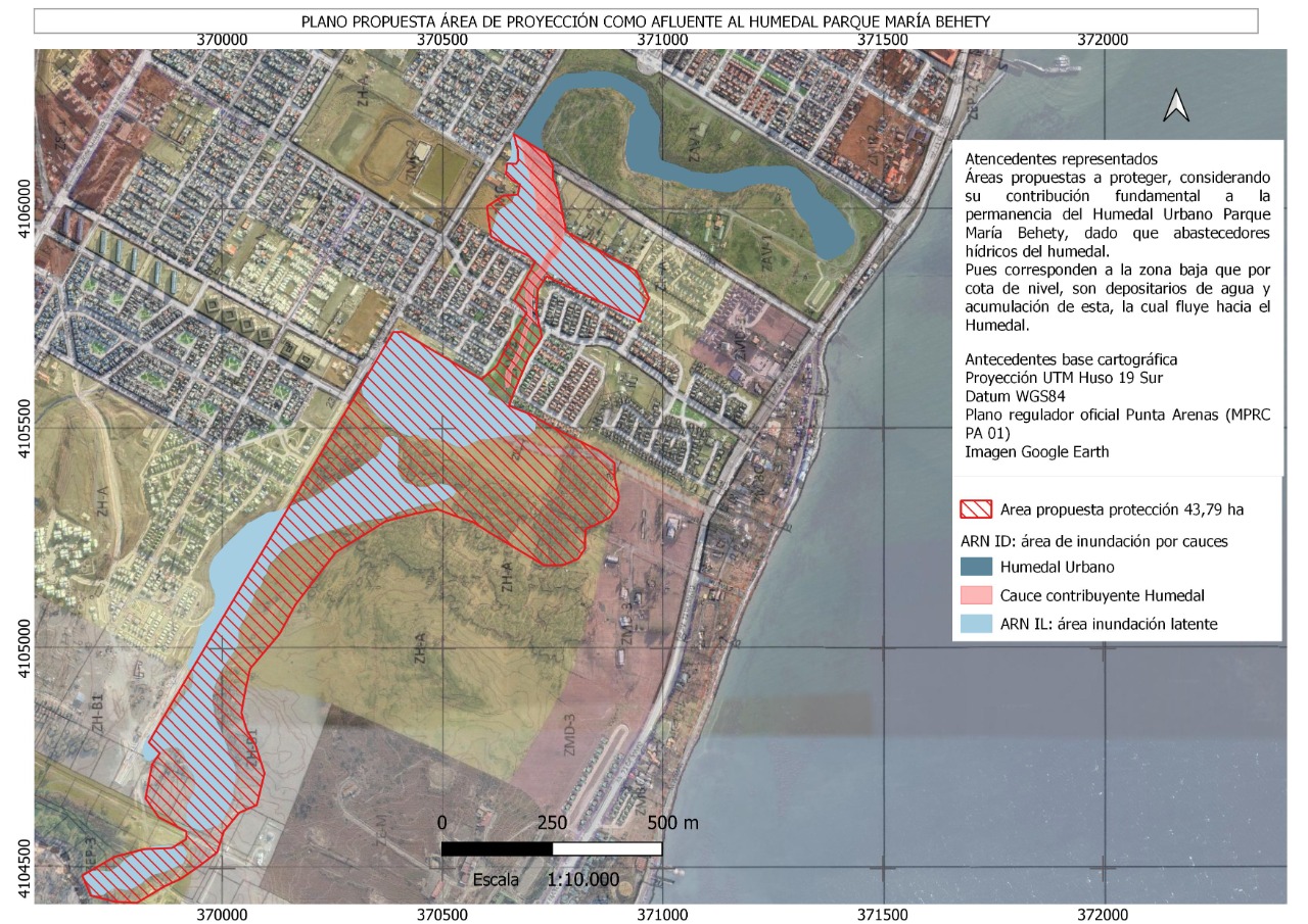 El segundo aspecto señala que el plano regulador de Punta Arenas es concluyente al mostrar cuál es el recorrido del cauce que alimenta al humedal del Parque María Behety. Por lo que se propone un área de protección de 43,79 hectáreas, considerando su contribución fundamental a la permanencia del Humedal Urbano Parque María Behety, como abastecedor hídrico, pues corresponde a la zona baja que por cota de nivel deposita aguas y acumulación de estas, las que fluyen hacia humedal del parque con reconocimiento. En la imagen del plano es posible apreciar la interrelación del área propuesta de protección, el área de inundación por cauces, el humedal urbano, el cauce contribuyente al humedal y el área de inundación latente.