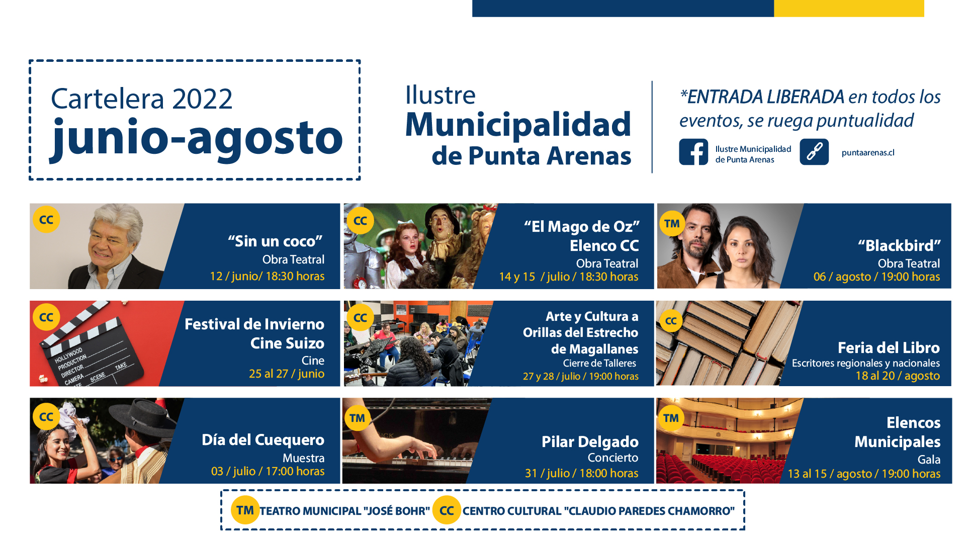 Nueve distintas actividades, incluye la Cartelera Cultural preparada desde el Municipio de Punta Arenas para el segundo semestre del año, que tiene por objetivo que el público magallánico disfrute de las manifestaciones artísticas de manera gratuita.