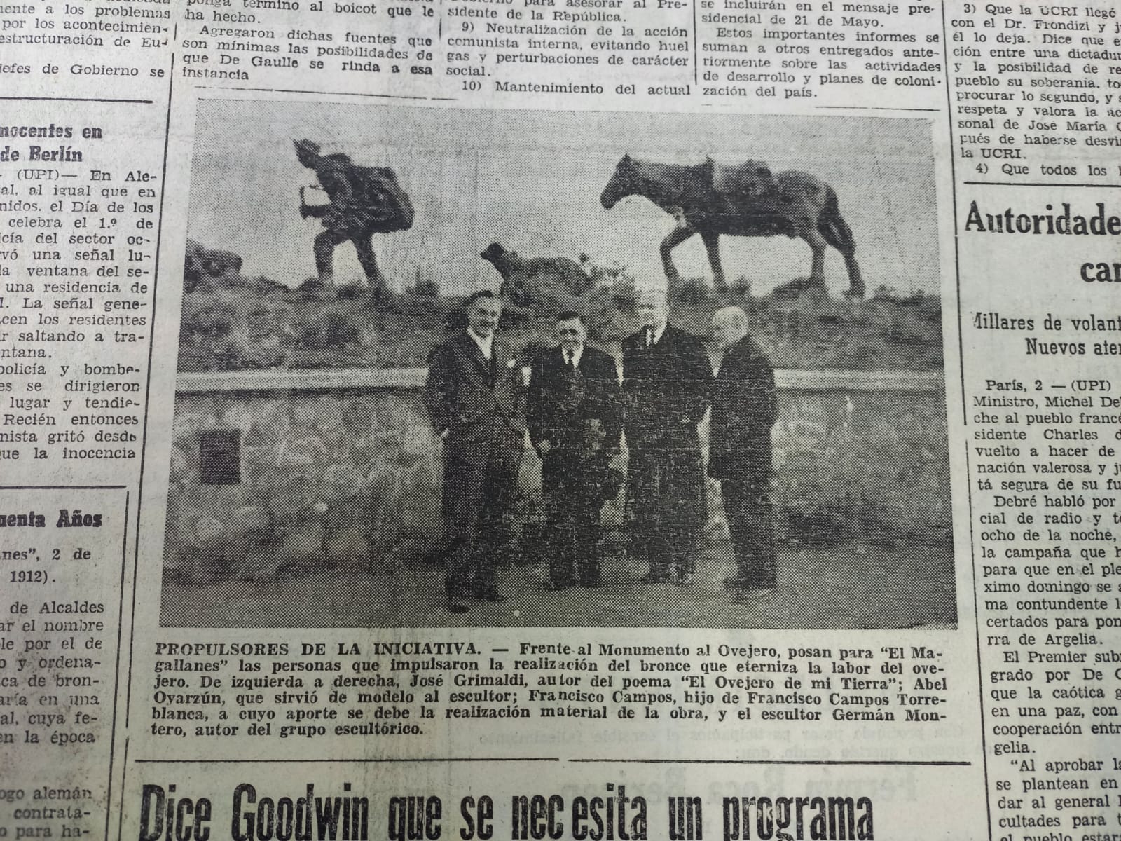 Foto: De izquierda a derecha: José Grimaldi, el ovejero Abel Oyarzún, Francisco Campos Menéndez, y el escultor German Montero