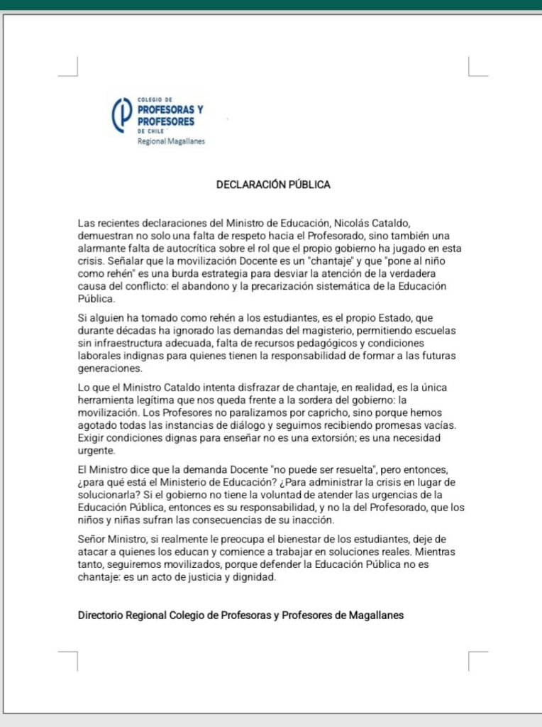 A continuación el comunicado de prensa del Colegio de Profesores: