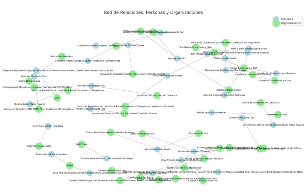 En el siguiente gráfico se puede ver la red de relaciones entre personas y organizaciones, a propósito de las observaciones que se llevaron a cabo y que fueron informadas por el Panel: